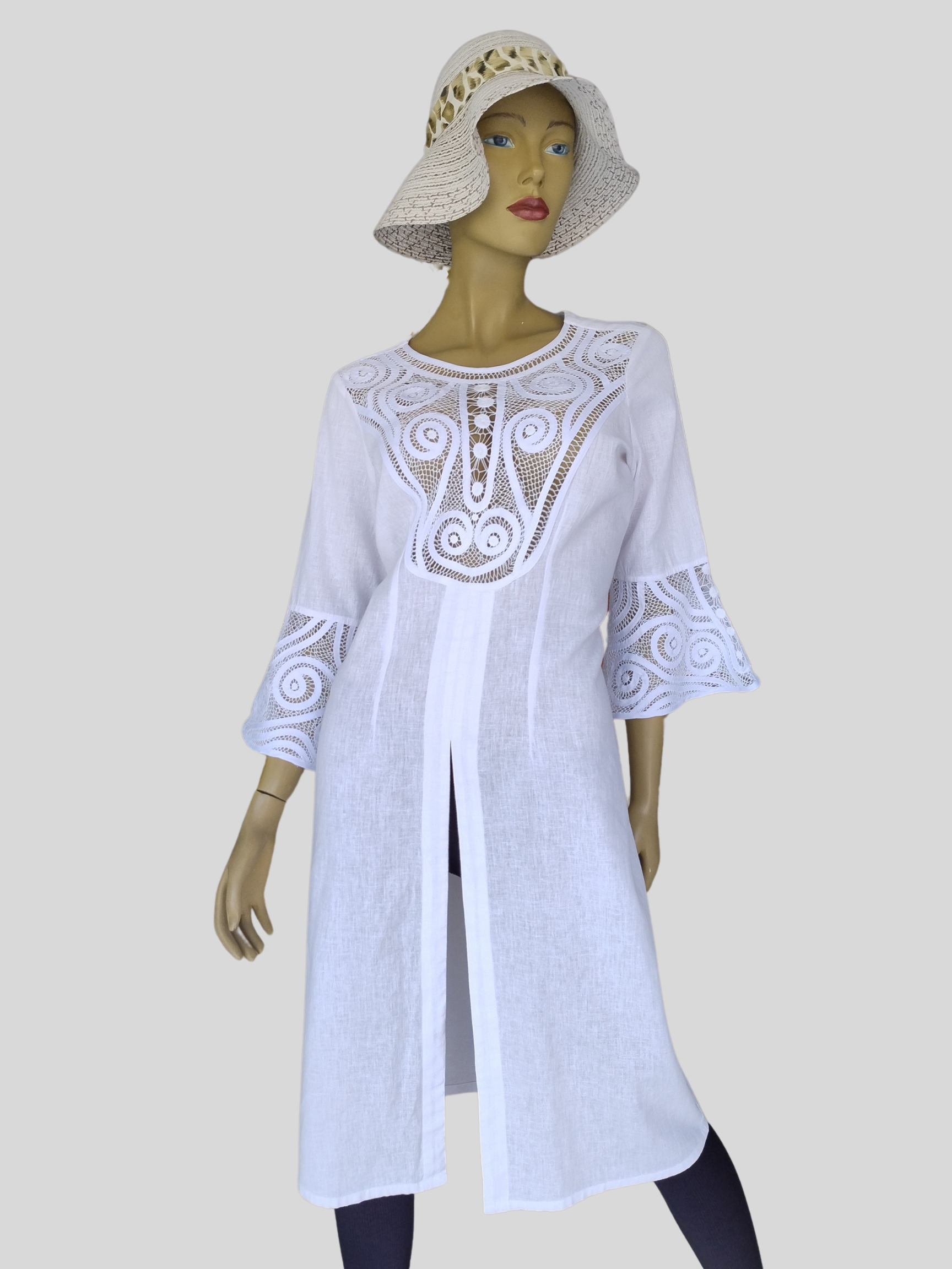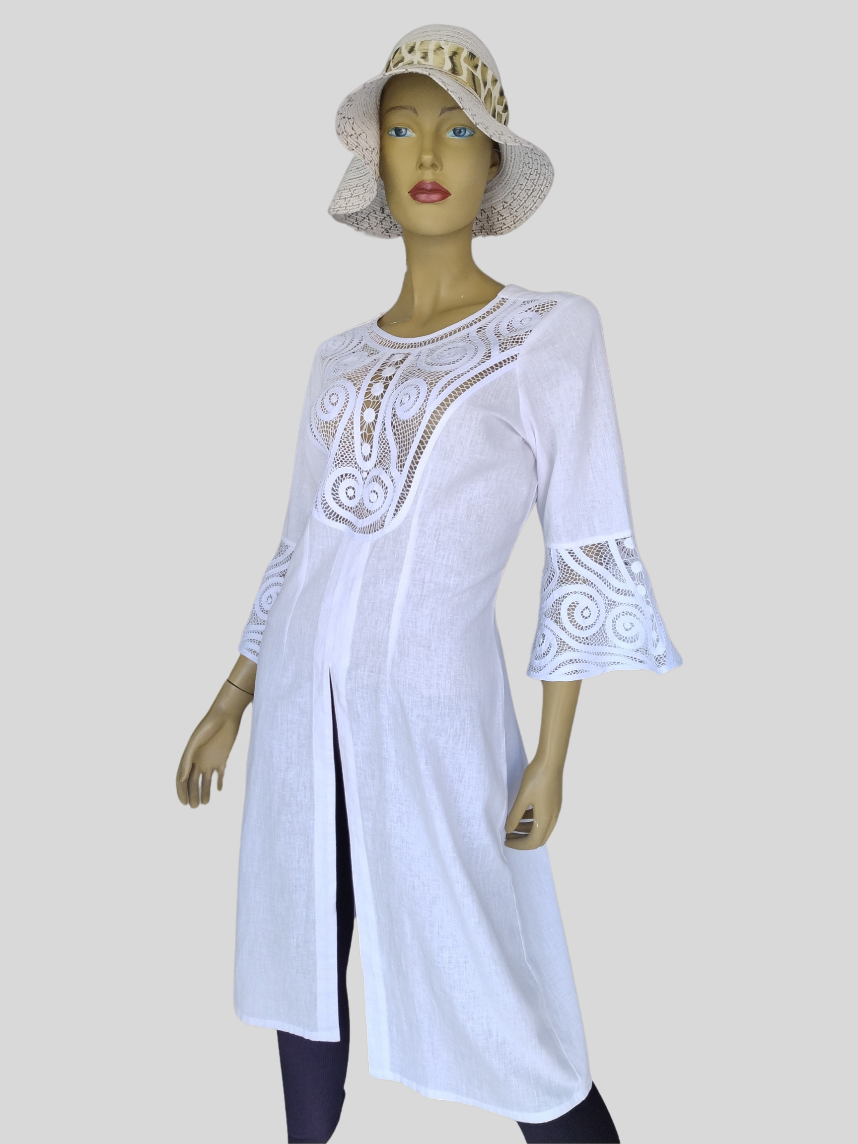 Hermosa prenda de mujer conocida como gabán, quimono, sobre todo o bluson, una prenda fabricada en tela lino, con diseño de cuello redondo, manga acampanada y abertura media frontal, cuenta con bordado en pecho y mangas en técnica de malla sobre sesgo, es una piesa elegante para usuario sobre pantalón o short que siempre hará lucirte donde vallas.