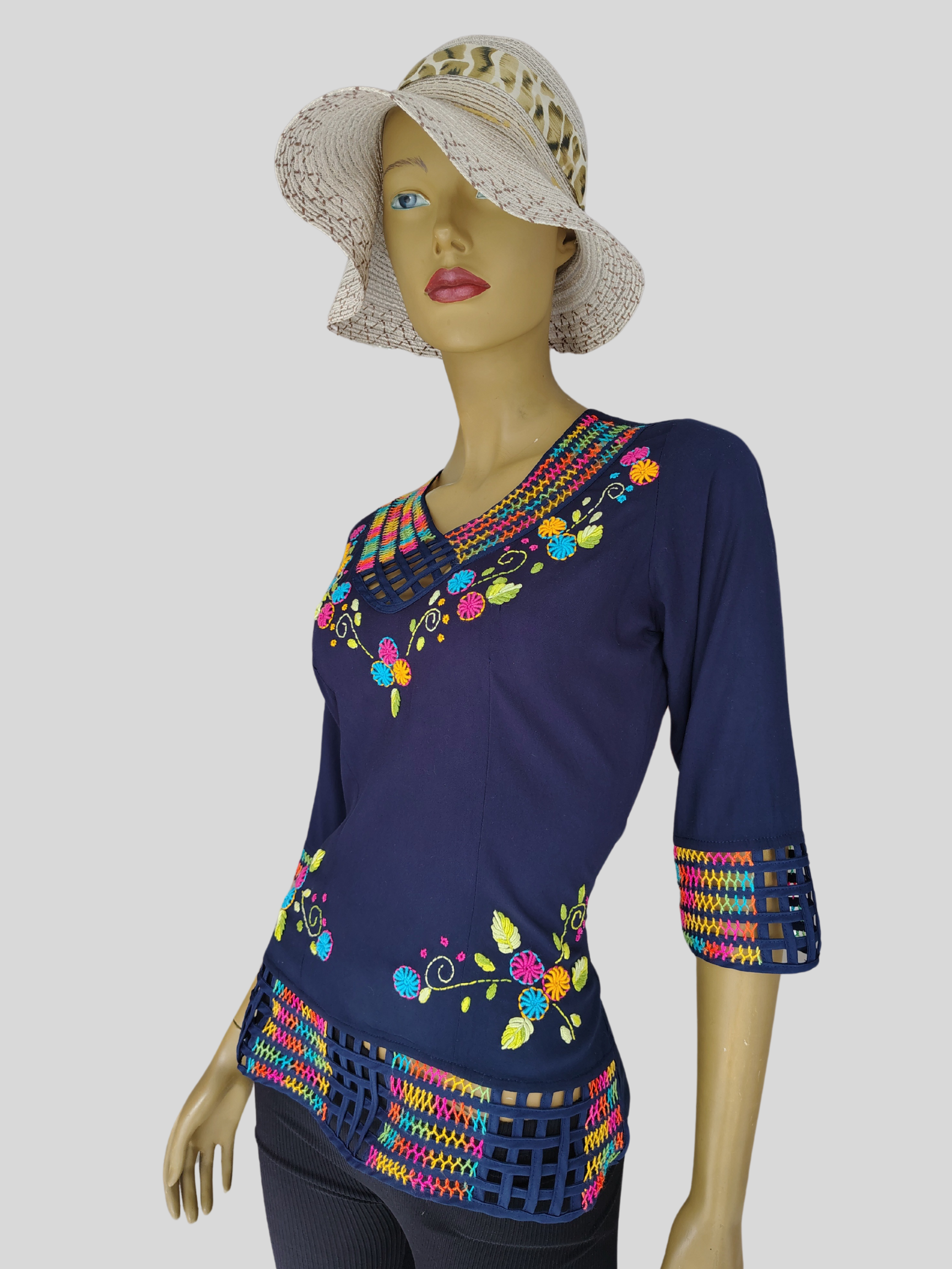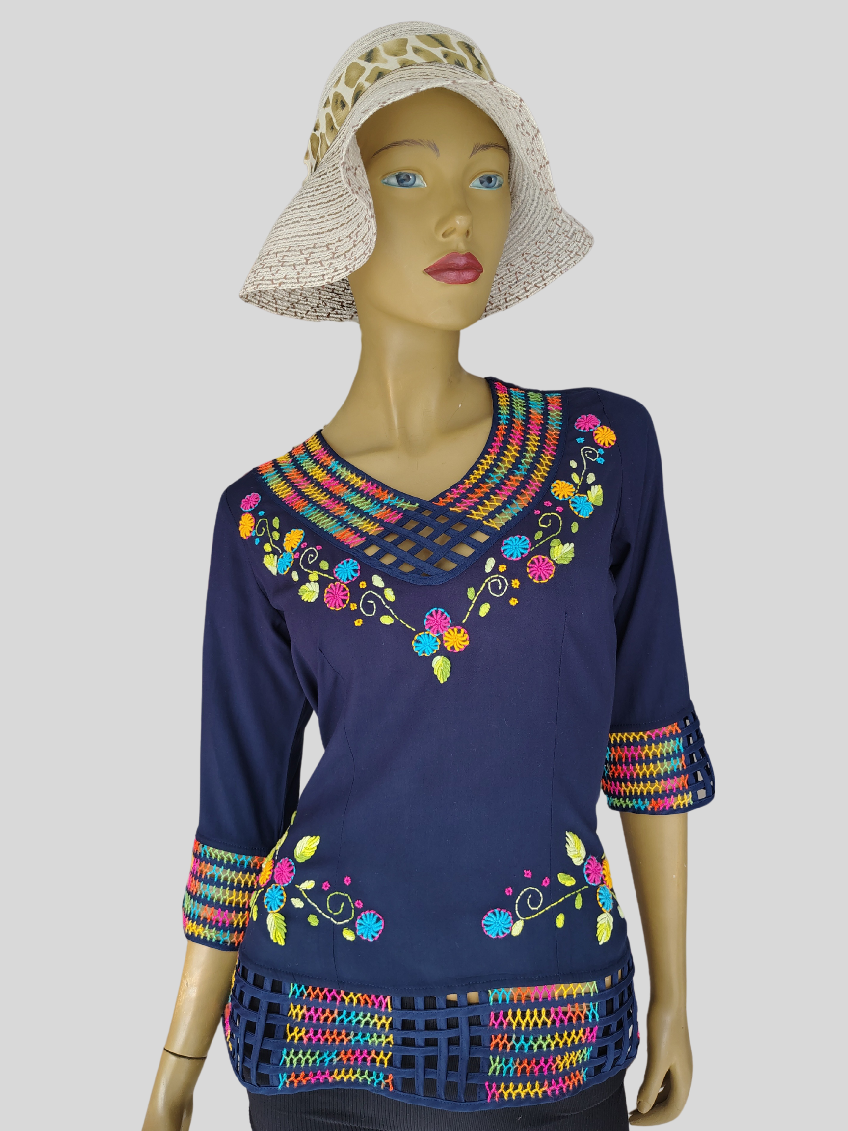 El modelo Maite destaca por sus bordados detallados en color Azul oscuro, que le dan un toque único y femenino. Además, cuenta con mangas 3/4, ideales para lucir en cualquier ocasión.