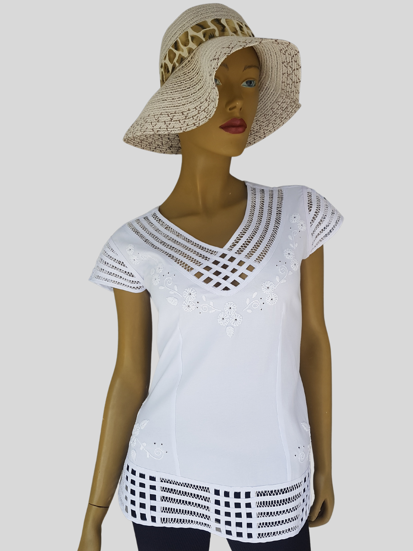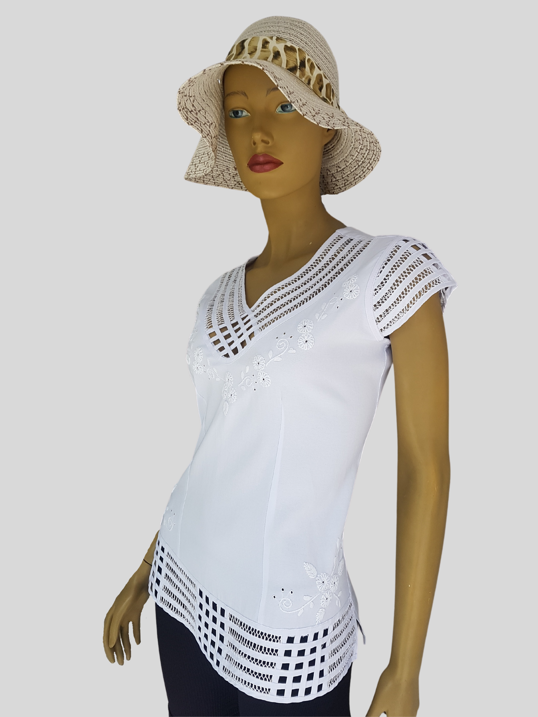 Hermosa blusa para dama fabricada en tela lino, tiene diseño cuello en V, manga corta y largo medio, esta bordado en sesgo en técnica de pate cabra, adicional flores acompañando la almilla del cuello en rococo, una prenda para cualquier tipo de ocasión.