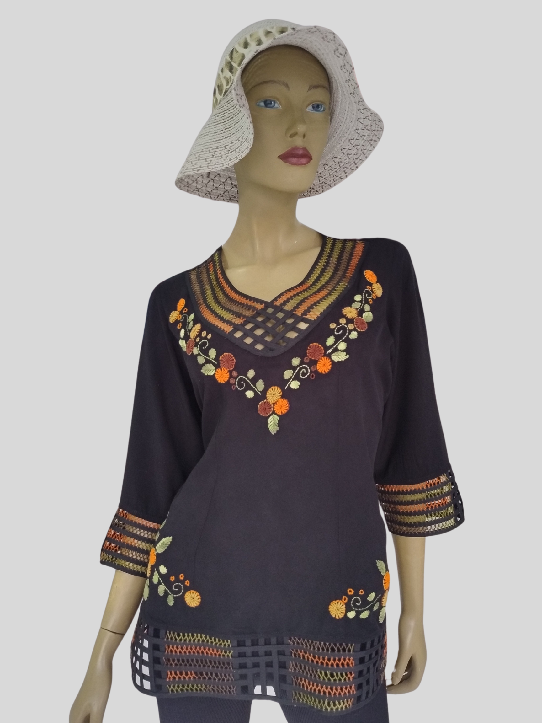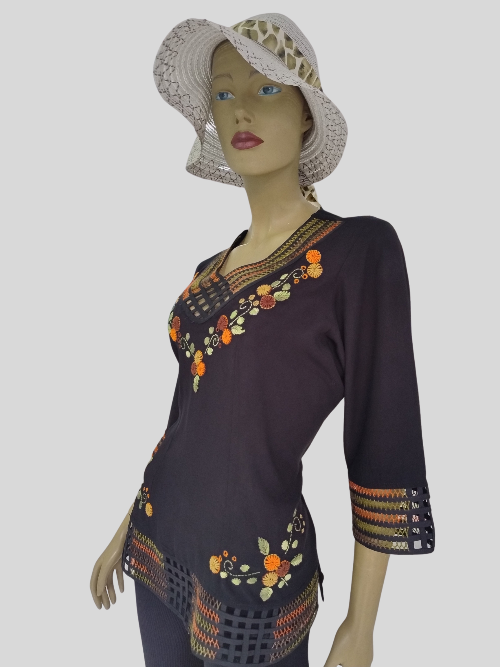 El modelo Maite destaca por sus bordados detallados en color negro, que le dan un toque único y femenino. Además, cuenta con mangas 3/4, ideales para lucir en cualquier ocasión.