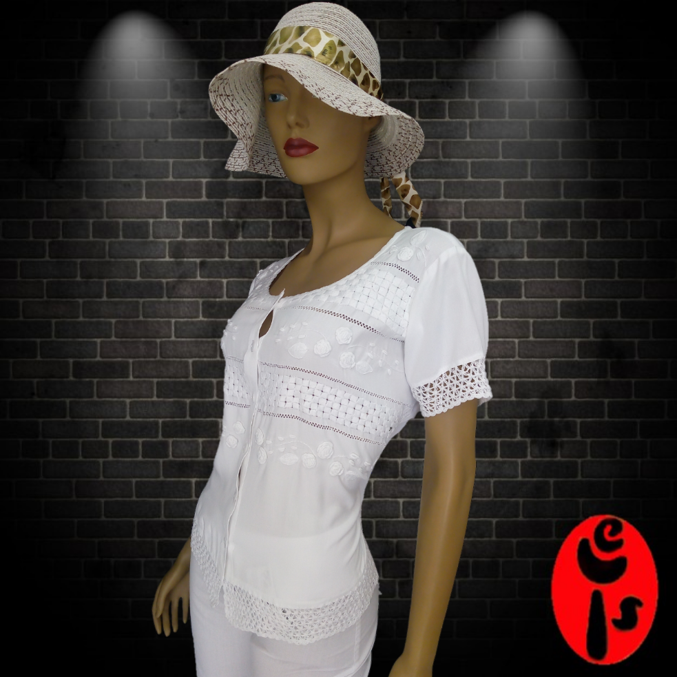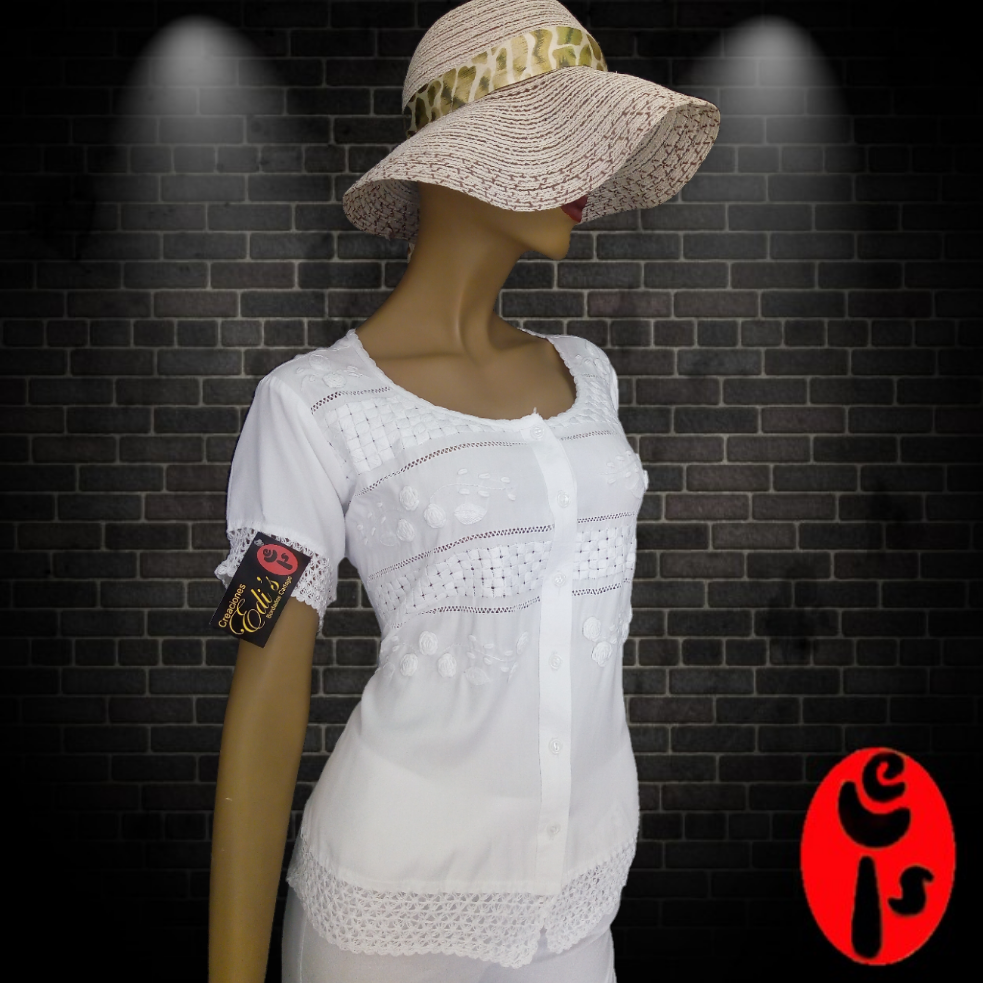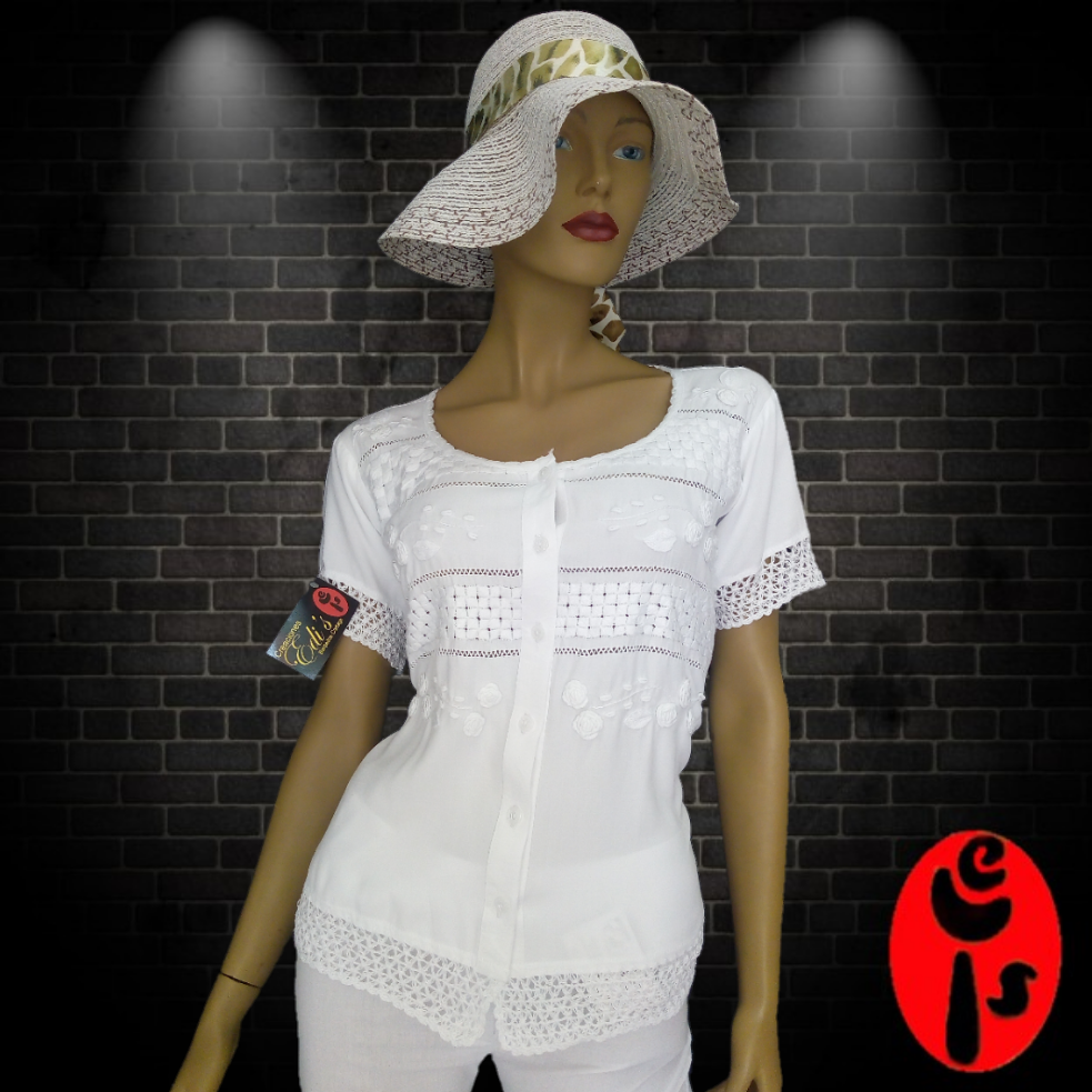Hermosa blusa para dama fabricada en tela chaliz, tiene diseño de con cuello redondo, botones frontales y manga corta, esta bordad en técnica de calado, rococo y cadeneta, adicional tiene crochet en manga y bolero inferior.